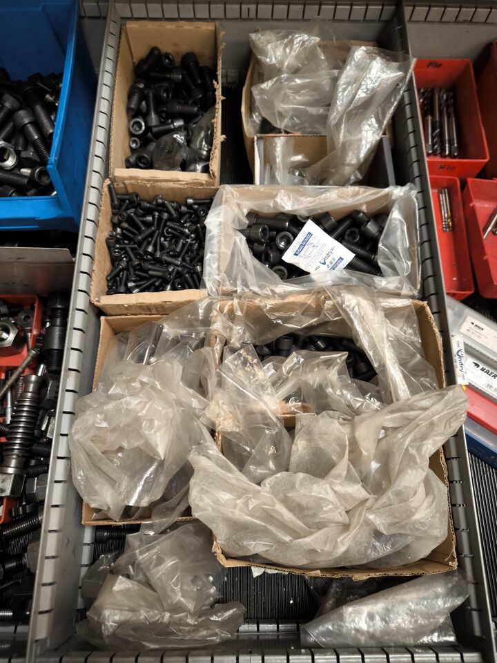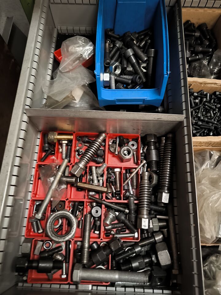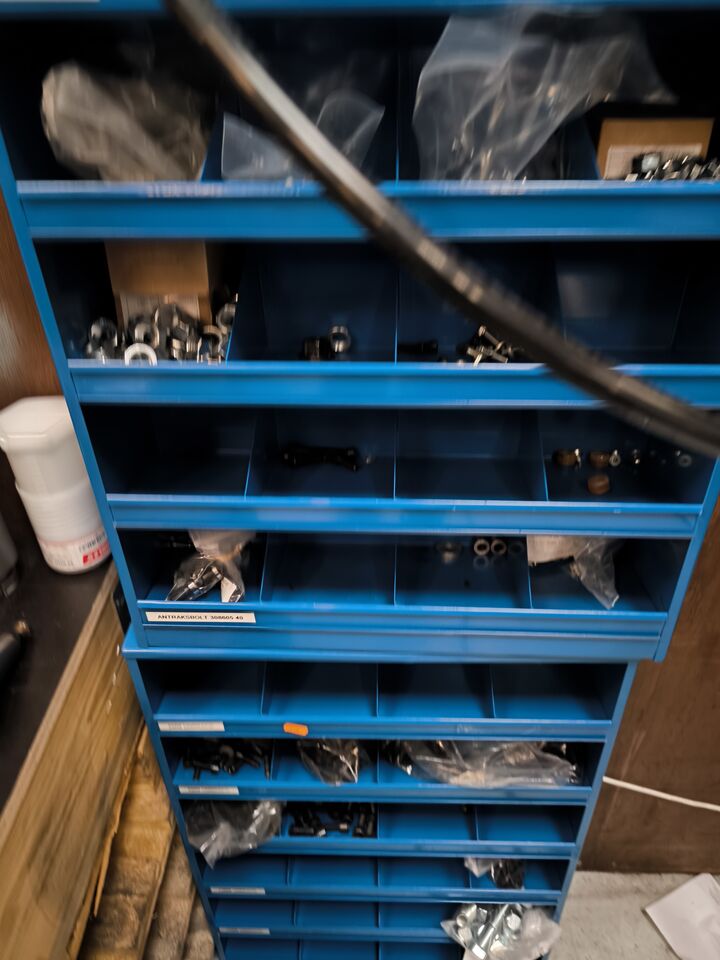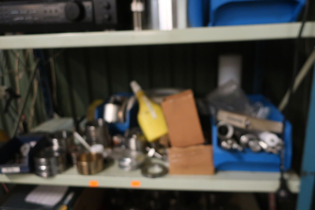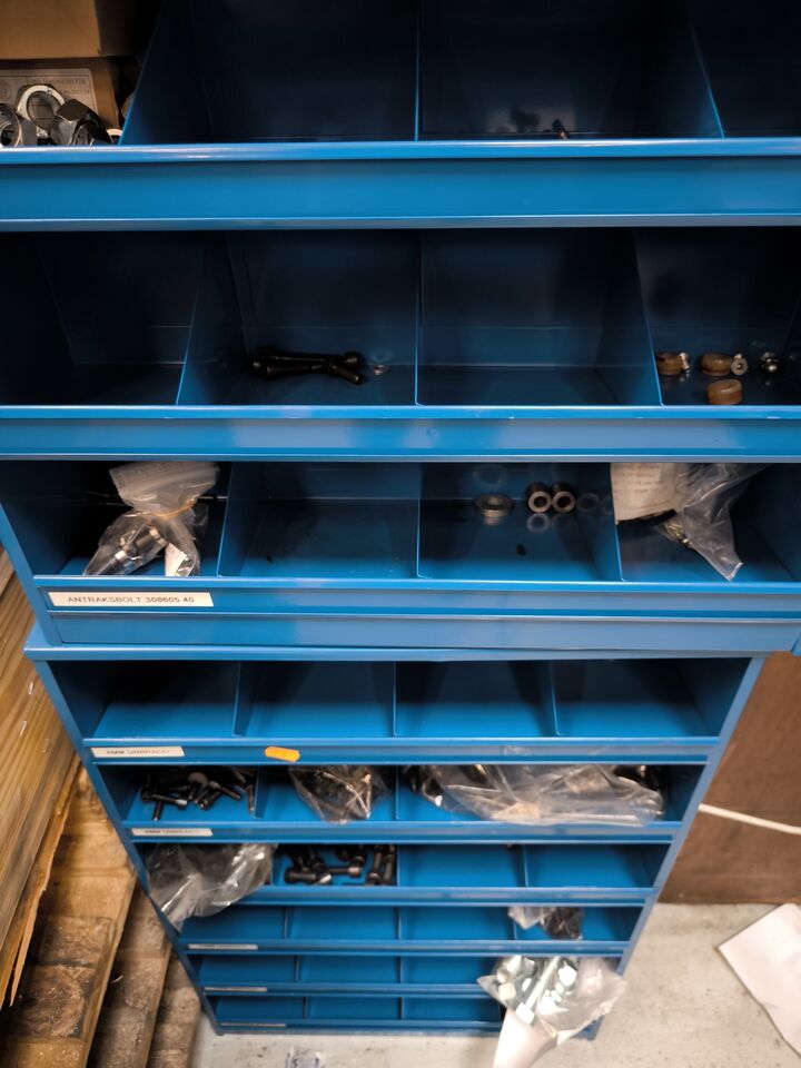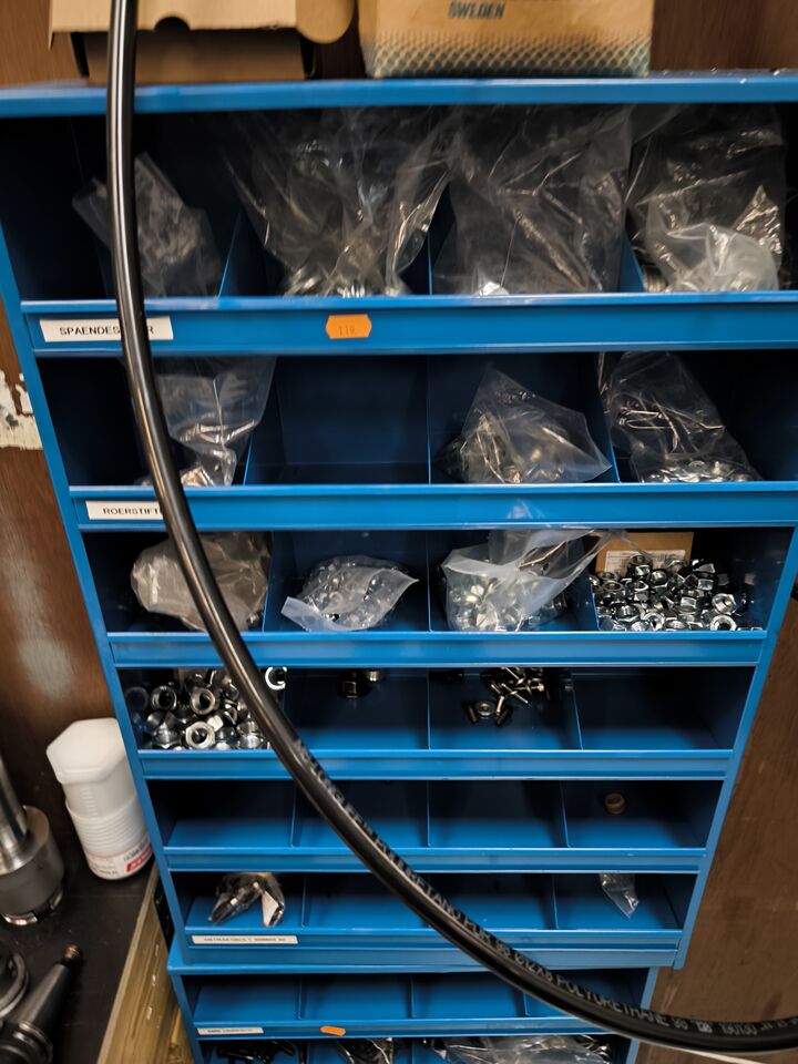 Værkstedsreoler med diverse møtrikekr m.m.