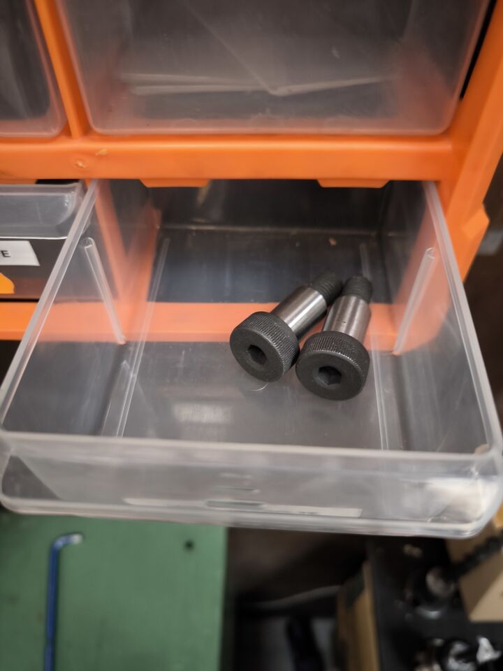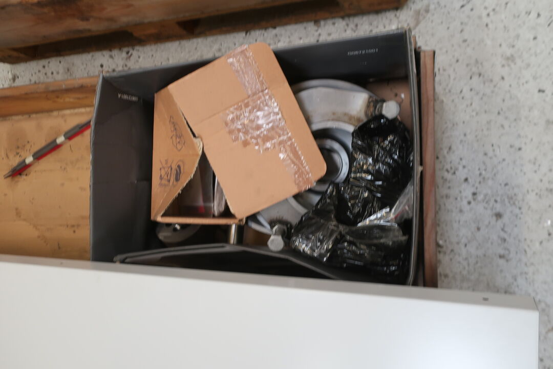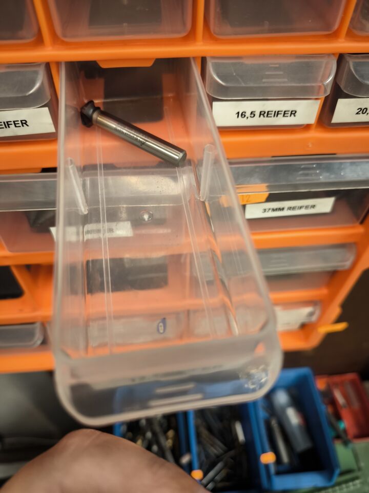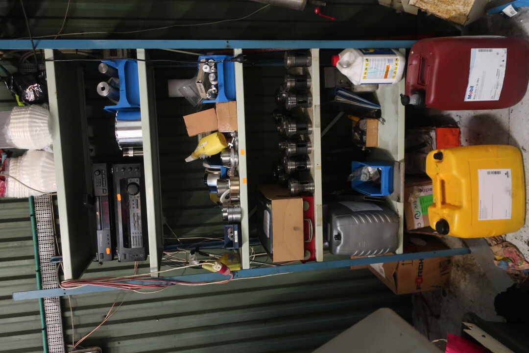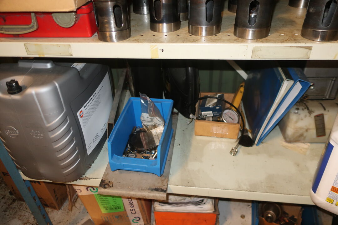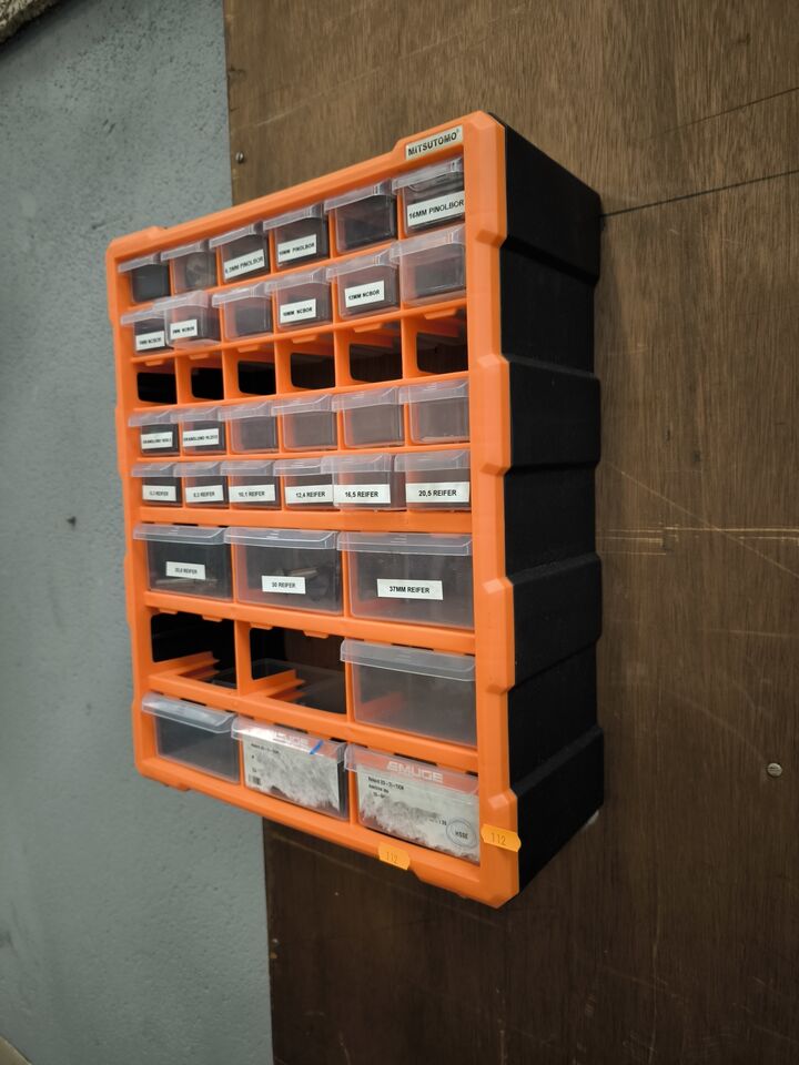 Værkstedsreoler med diverse møtrikekr m.m.