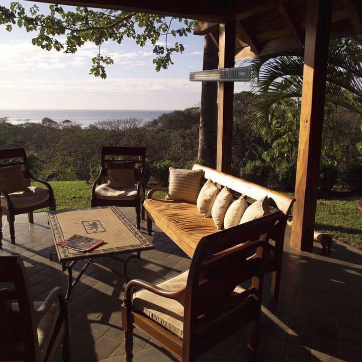Varmen fra den væghængte terrassevarmer reguleres nemt på den medfølgende fjernbetjening der også styrer timeren.