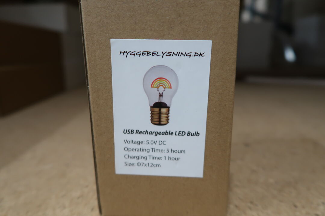 Lampen er genopladelig og lyser ca. 5 timer på en fuld opladning.