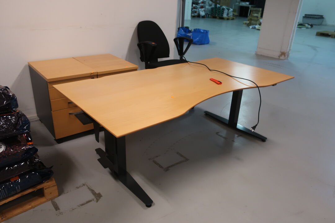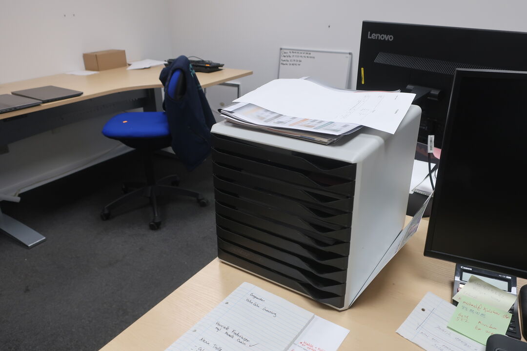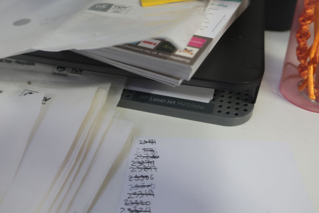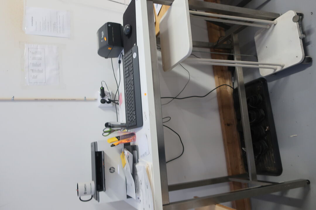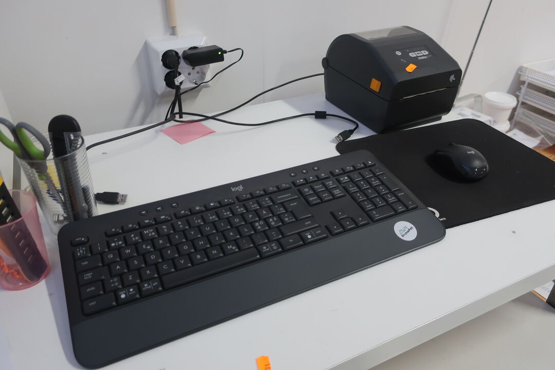 A7694 L571 - Bord, printer HP, labelprinter ZEBRA samt affaldsstativ