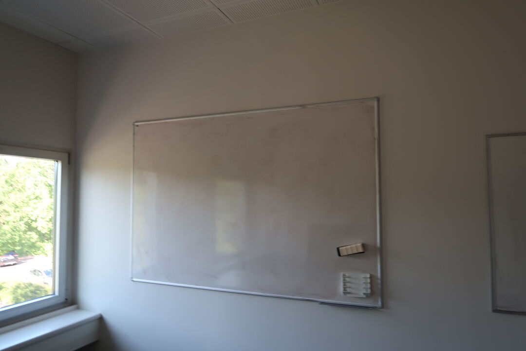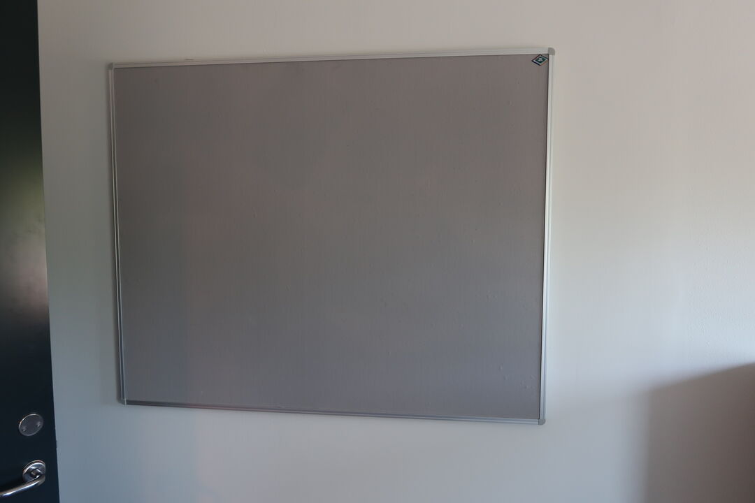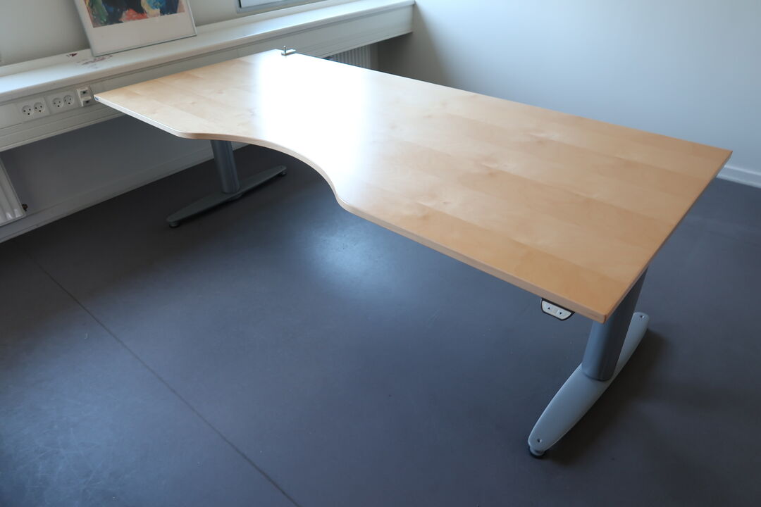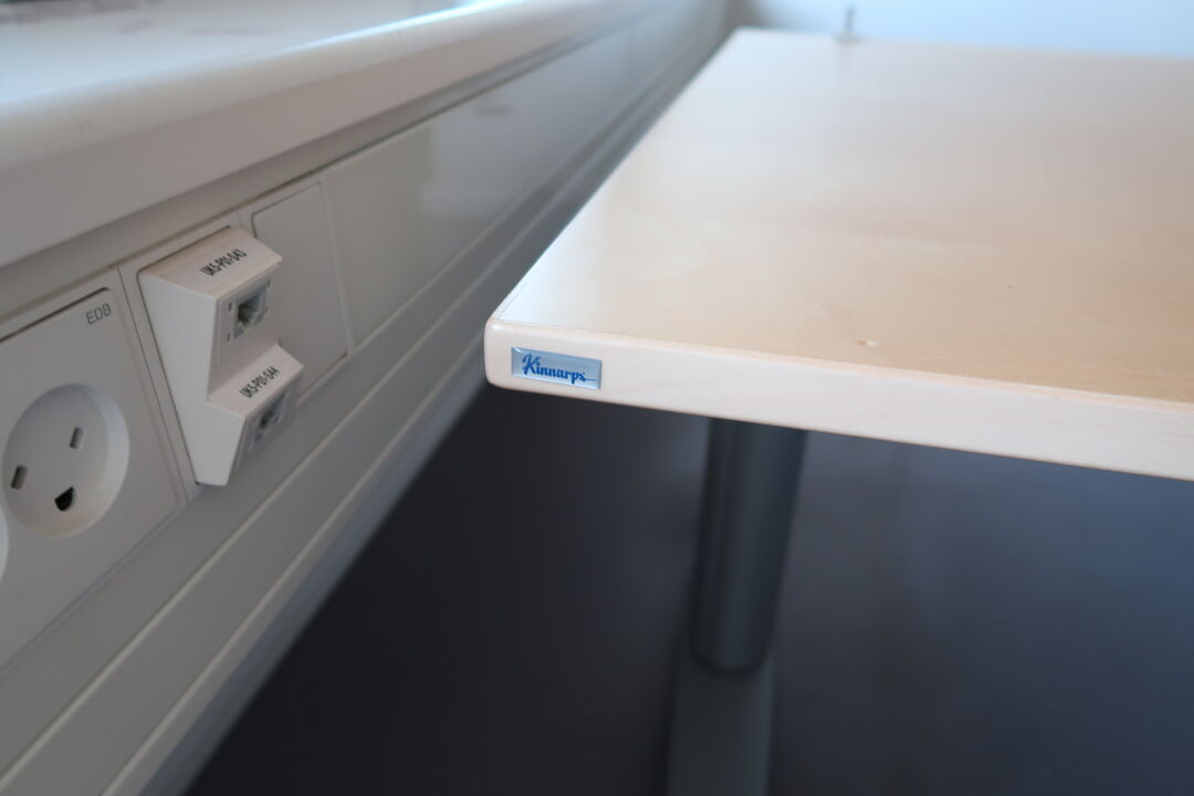 A7001 L2043 - El. hæve/sænke skrivebord KINNARPS, reol, whiteboard m.m.