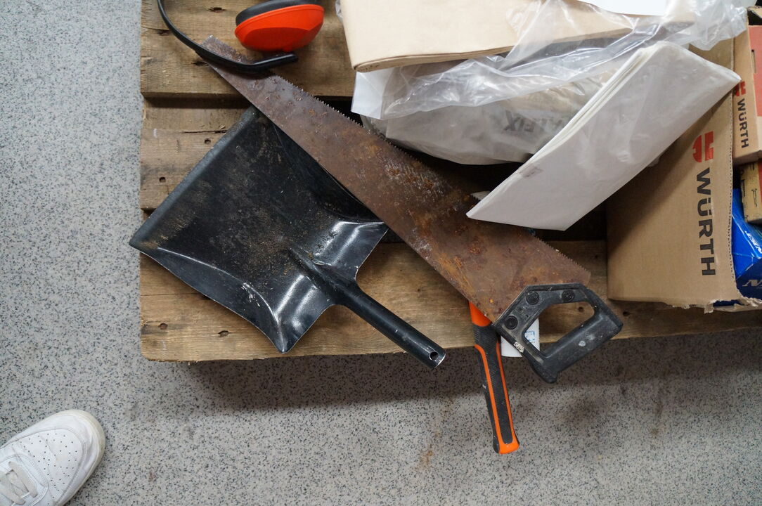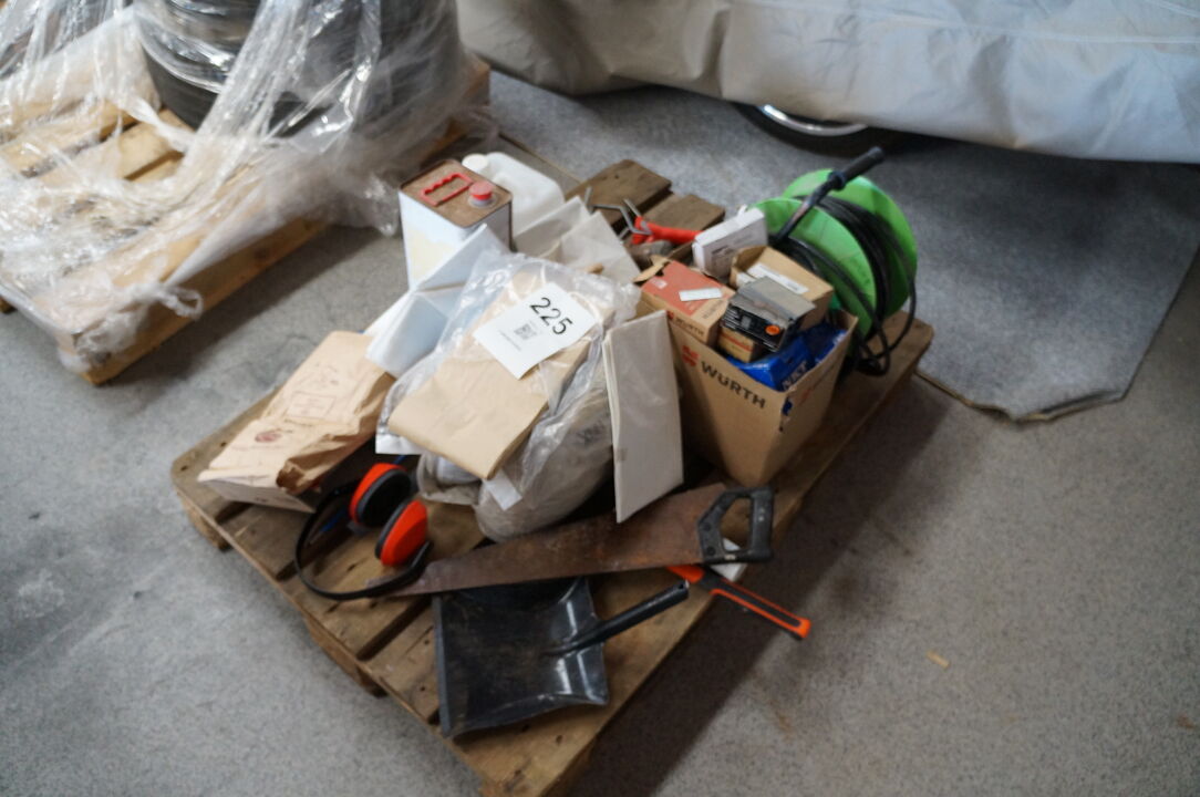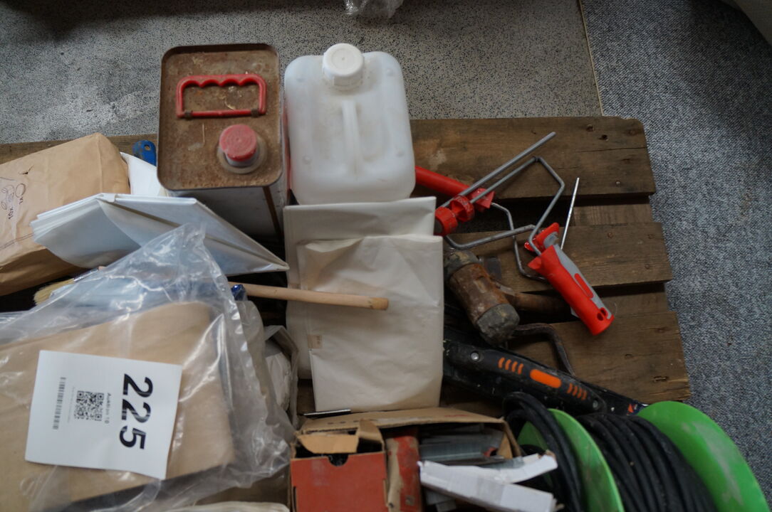 A6628 L225 - Palle med diverse byggematerialer, kabeltromle, m.v.